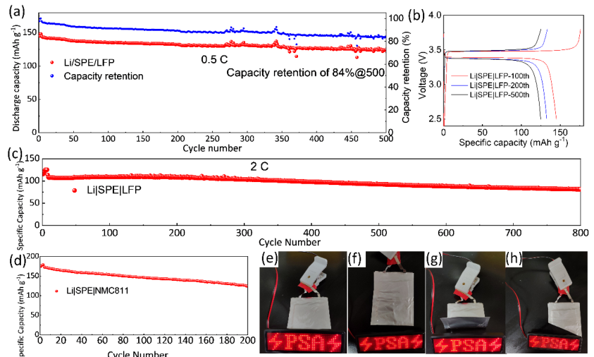 ȫ�̑B(t��i)Li|SPE|LFPȫ늳�Ҳ��70cPSA��늽��|(zh��)�M�b���ɡ���D5a�͈D5b��ʾ����0.5C������ܶ��£�ѭ�h(hu��n)500Ȧ��ķ��������124.9 mAhg-1������������>84%����2C�ĸ�����ܶ��£��M�b��늳��Ծ��з�(w��n)����ѭ�h(hu��n)���ܣ�ѭ�h(hu��n)800Ȧ�����������ʞ�71%���D5c����ʹ�ø߉����ONMC811�M�b늳أ���D5d��ʾ����0.5C������ܶ���(1C=180mAh g-1)��늳���25���µij�ʼ���������174.6 mAh g-1����0.5C��ѭ�h(hu��n)200Ȧ��늳��Ա��F(xi��n)��124.3 mAh g-1�ķ�����������������ʞ�71%���@Щ�Y(ji��)���C���˻���ԓSPE��LMBs���з�(w��n)����ѭ�h(hu��n)���ܡ���D5e-h��ʾ�����M�b��10mAhܛ��늳ؼ�ʹ��ᘴ̻��и�ɎK��LED���Կ��l(f��)�⡣�@����70cPSA���l(f��)ճ���Ժ������Կ�����Ч�ط�ֹSPE���؏�(f��)׃���^(gu��)�����c늘O֮�g�ķ��x��