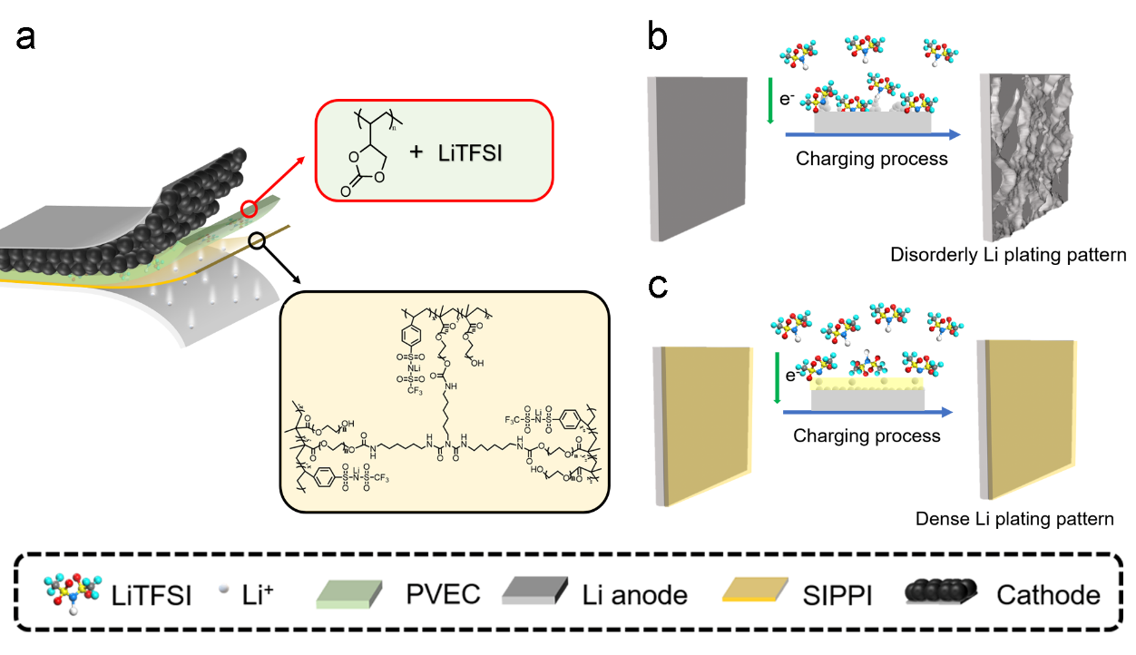 ���գ�����������W���i�w���ں����_��W��I������ACS Applied Materials and Interfaces�l���������о���Փ�ġ�A Single-Ion Conducting Polymeric Protective Interlayer for Stable Solid Lithium-Metal Batteries����������������B��һ�Nǰ��δ�е���߾ۺ���늽��|��x���w�Ɣ�(tLi+)�ķ��������ھۺ���늽��|��䇽���늘O֮�g����һ�����x�ӌ�늾ۺ��ﱣ�o�A��(SIPPI)��ԓ�������OӋ�`�Ё������մ�늽��|��늘O֮�g�ĊA���Լ�����Һ�w늽��|�ľۺ��ﱣ�o�ӵ��OӋԭ�t��SIPPI���ؓ�O�ϲ��H���F�����x�ӌ�����|�����Ҿ������õ����W���ܣ�������Ч����������ݶȣ�����֦�����L��ͨ�^ԓ�������F�˸��x��늌���(1 mS cm-1, 30 ��C)����tLi+(0.79)�͌�늉����ڡ�SIPPI���o�Ĺ̑B䇌��Q늳���3 mA cm-2�l�����@ʾ������ѭ�h���^6000С�r��SIPPI���o��䇽���늳ؿ�����1C��ѭ�h���^1000�Σ����������ʸ��_86%���@�N���ؓ�O�ϼ���SIPPI�������錍�F�������ܶȡ��Lѭ�h��������ȫ���ԃr�ȵĹ̑B늳��ṩ��һ�N������ԡ�