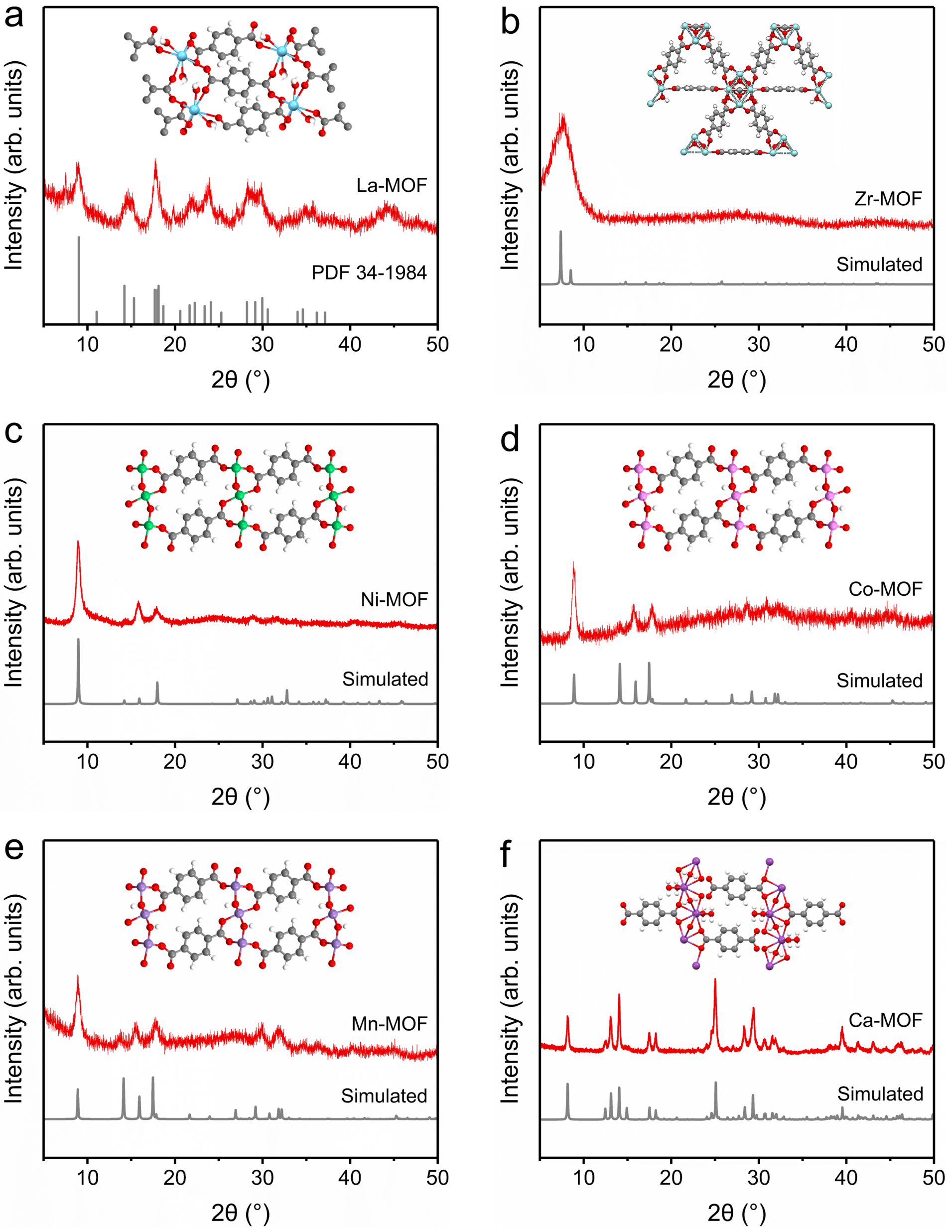 X�侀������XRD�������ϳɵ�MOFs�������_�ľ��w�Y�����D2����La-MOF������La2(BDC)3(H2O)4 [PDF#34-1984]���ϳɵ�Zr-MOF�Y�����^�λ��7.5���ķ�������Zr6O4(OH)4(BDC)6����UiO-66 [CCDC No. 2054314]��Ni-MOF������Ni2(OH)2(BDC) [CCDC No. 985792]����Ni-MOF�ľ��w�Y���У������ɷN�����w��λ��Niԭ�ӡ�Ni(1)ԭ���c4��-OH ��2��BDC��Oԭ�����B��Ni(2)ԭ���c2��-OH ��4��BDC��Oԭ�����B��Ni-O6�����w��B���γɶ��Sƽ�棬����BDC�B���γ����S�Y�������⣬Co-MOF������Co2(OH)2(BDC) [CCDC No. 163140]��Mn-MOF������Mn2(OH)2(BDC)�������ľ��w�Y����Ni-MOF��ơ�Ca-MOF������Ca(BDC)(H2O)3 [CCDC No. 870928�� PDF#46-1873]��