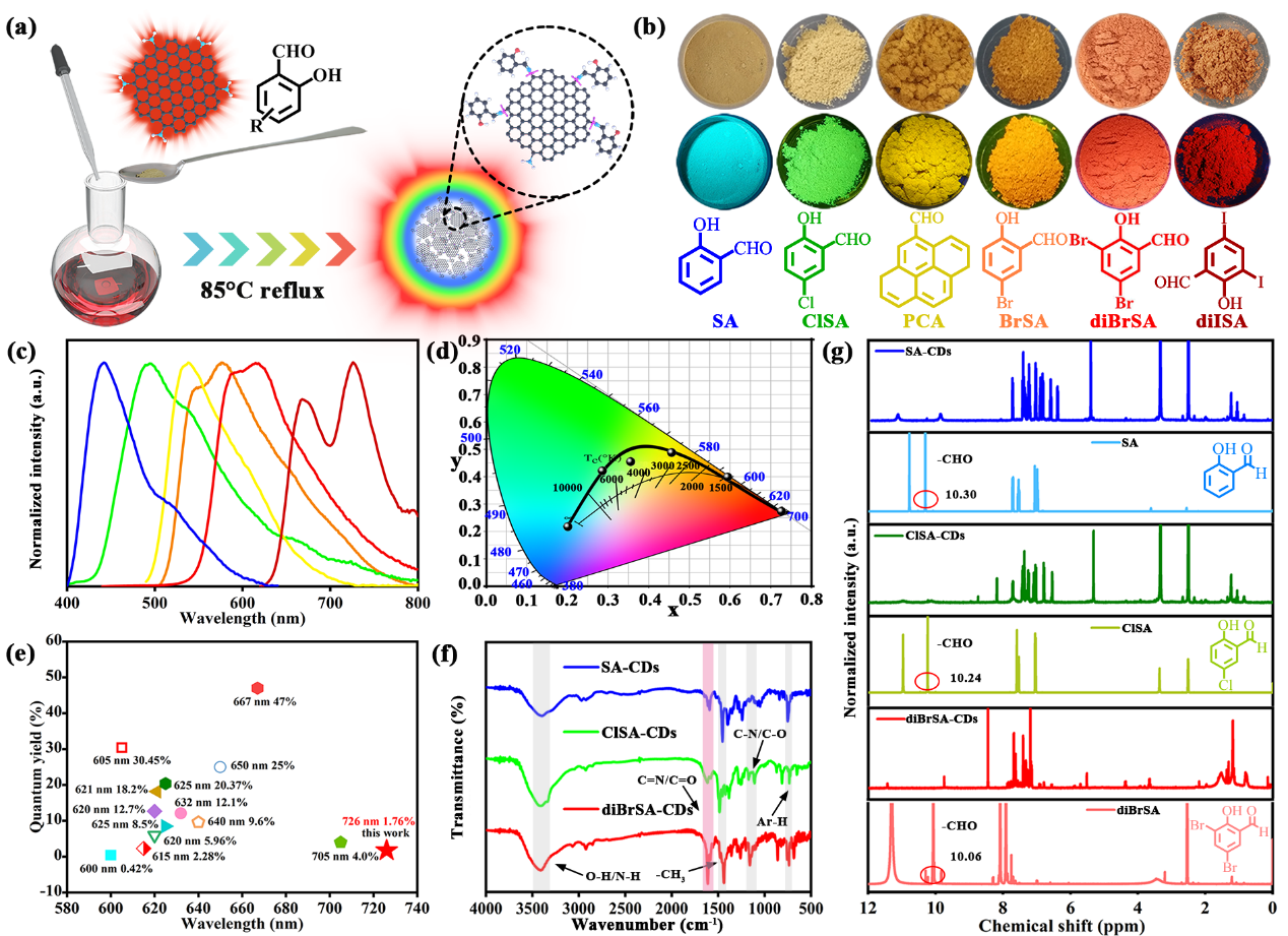�D1. ��ɫSSF CDs�ĺϳ��c������ a) ͨ�^ϯ��A�����ϳ�SSF CDs�ĺϳ�·���� b) ��: SSF CDs��ĩ���չ��365 nm�����µ���Ƭ����: SA����������ĽY��ʽ�������Ŀs�����Q��c) ��ɫSSF CDs��PL���V��d) SSF CDs��CIEɫ���ˡ�e) ���Y�˹̑B�t��CDs�İl���λ�ú�QYs�� f) SA-CDs��ClSA-CDs��diBrSA-CDs��FT-IR���V�� g) SA-CDs��SA��ClSA-CDs��ClSA��diBrSA-CDs��diBrSA��1H NMR�V�D��