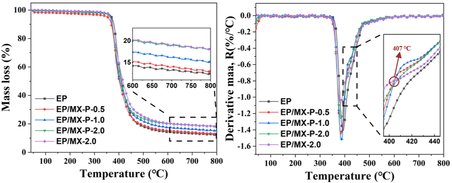 ͨ�^���ͺϲ��ϟ�ֽ�D�ķ������D5�����l�F����407 ����D���c�����@һ�D���c֮������MXene-PZN��EP�ͺϲ��ϵğ�ʧ���������δ����Mxene�cEP�͏ͺϲ��Ϻͼ�EP���϶����@���͡�ֵ��ע����ǣ��@һ�ض��D���c�cMXene-PZN���yԇ��DTG�����е�����ʧ�����ʌ����Ĝض�����ϡ��������ϰl�F�����Եó�MXene-PZN�cEP�ͺϲ��ϵğή���^�̿��Է֞�ɂ��A�Σ��ڵ�һ�A��Ti3C2TX�Ķ��S�Ӡ�Y���܉���Ч����EP���ĵğ�ֽ����ʣ����ڶ��A�μ�ʹ�������H��0.5 % MXene-PZN�ďͺϲ��ϣ����ֽ�����ҲҪ��������2 %δ���Ե�Ti3C2TX�ďͺϲ��ϡ��@�f��PZN�cMXene֮�g���څfͬ���ã��п��ܱ����˲���MXene��Ƭ�ӵĽ��⣬�Ķ������ˏͺϲ����ڵڶ��A�εğ᷀���ԣ����@һ�c�ں�����о���Ҳ�õ��C����