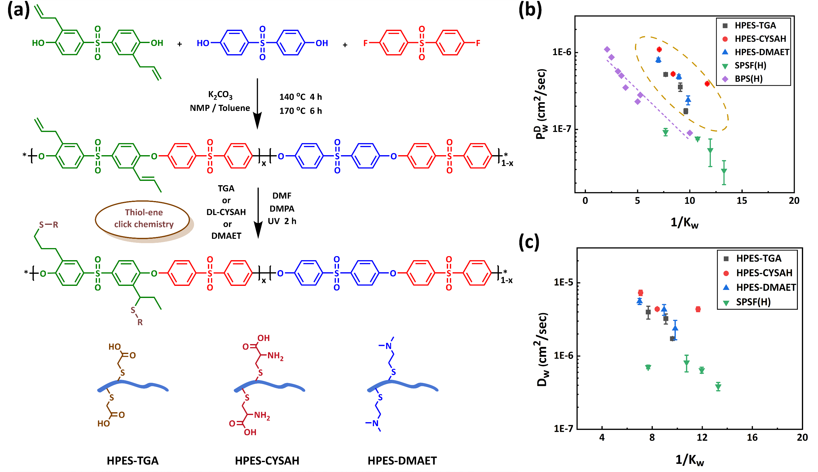 �D1 (a)�Hˮ��������(HPES)�ĺϳ�ʾ��D��(b)�Uɢˮ�B��()�cˮ�ܽ�ϵ���ĵ���(1/Kw)֮�g���Pϵ��(c)ˮ�Uɢϵ��(Dw)�c1/Kw���Pϵ