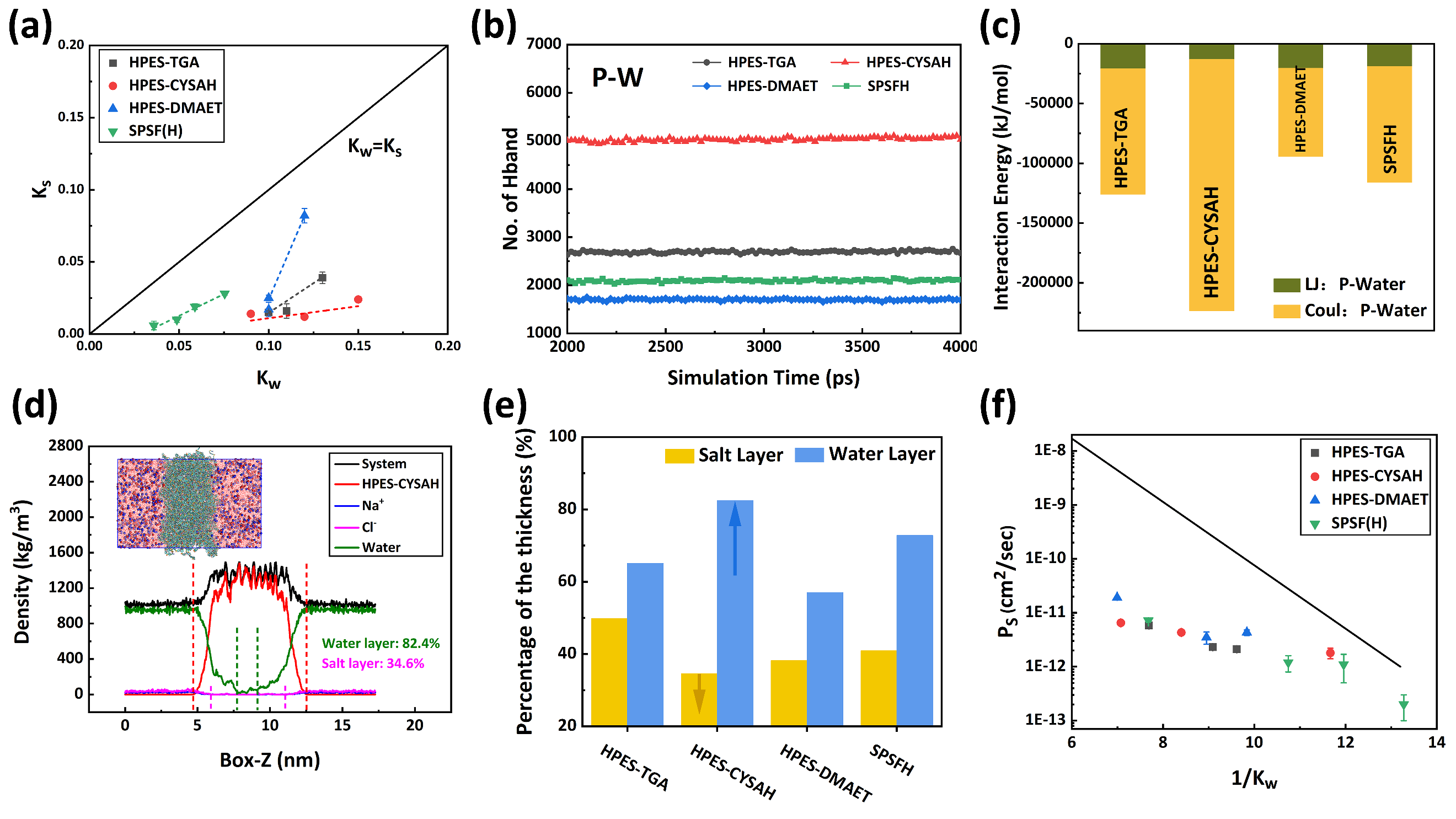 �D4 (a)ˮ/�}�ܽ��x����(Kw/Ks)����Kw�ĺ�����(b)ˮ/�}�Uɢ�x����(Dw/Ds)����Dw�ĺ�����(c)ͨ�^ģ�M�yӋ��ˮ��Ĥ�������w�e�ߴ�ֲ�(FVD)��(d)ˮ/�}�B�x����(/Ps)����Uɢˮ�B��()�ĺ�����(e)����HPESB-CYSAH��HPESC-CYSAH��ˮ�}�\ݔ���Բ�ęC��