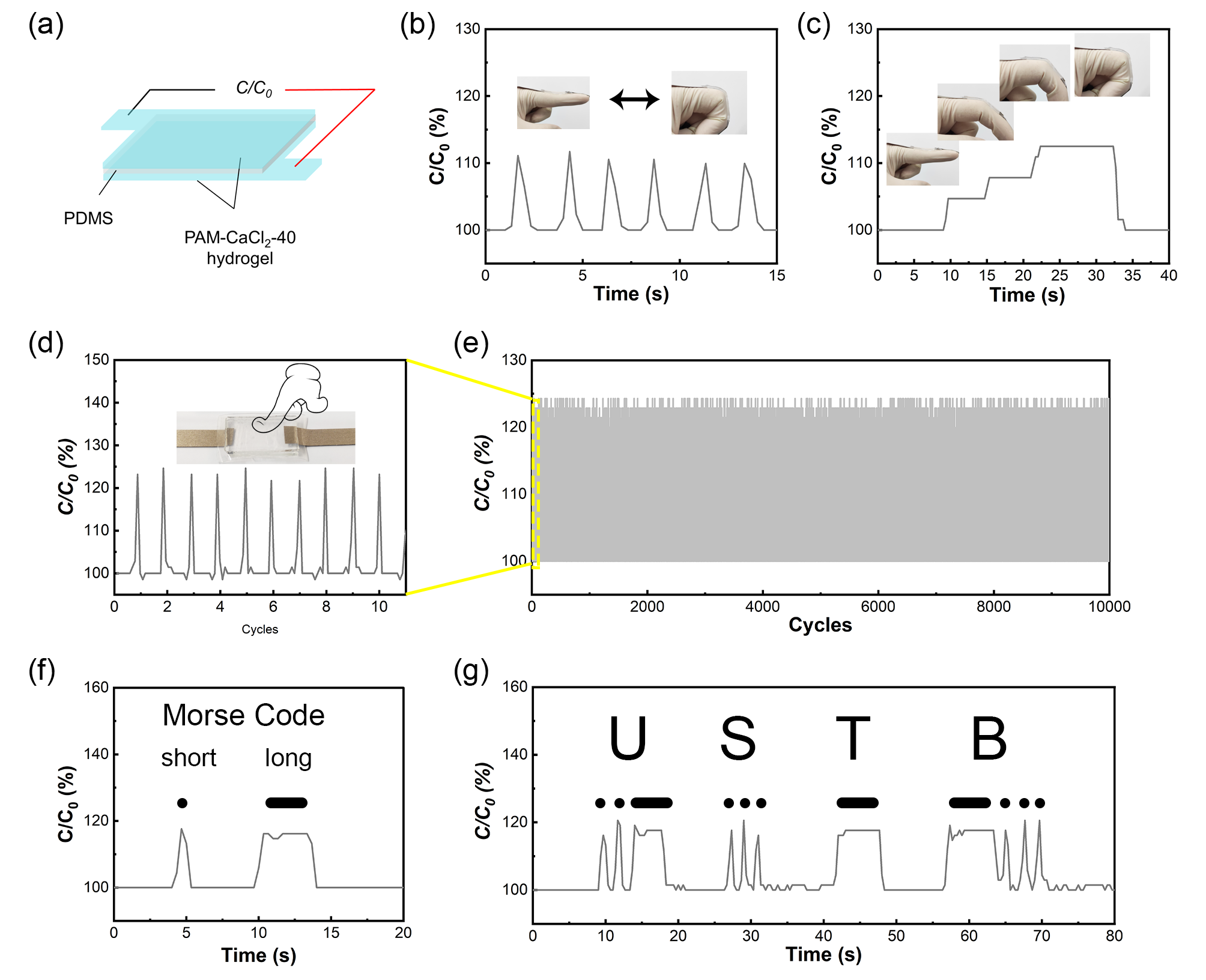 �D4. (a) PAM-CaCl2-40ˮ���z�B�m(x��)10000������ѭ�h(hu��n)��ѭ�h(hu��n)������(b) (a)�еIJ����Ŵ�(c) PAM-CaCl2-40ˮ���z�B�m(x��)10000������ѭ�h(hu��n)��đ�׃�֏͜y����(d) PAM-CaCl2-40ˮ���z����1000%����Ƭ��(e) PAM-CaCl2-40ˮ���z�B�m(x��)10000�����sѭ�h(hu��n)��ѭ�h(hu��n)������(f) (e)�еIJ����Ŵ�(g) PAM-CaCl2-40ˮ���z�B�m(x��)10000�����sѭ�h(hu��n)��đ�׃�֏͜y����(h) PAM-CaCl2-40ˮ���z���s90%����Ƭ��