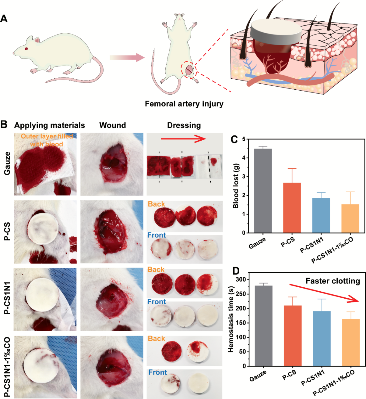 �����u��P-CS1N1-1��CO���d��ֹѪ���ܣ����߲�����SD����Ʉ��}�p��ģ�͡��D6B�У�ѪҺ��Ѹ�ٝB����������ӣ����nj��Q�Եĺ��dѪҺ�]�НB�������ⲿ����ˮ�ӎ��ǸɃ��ġ����ö���������﷽���x�躣�d�S������Ŀ��Y����������ѪҺ������ˮ���ܷ�ֹѪҺ������^�ȝB���_�����MѪҺ���̣��p��ʧѪ����Ч����ʧѪ������Ѫ�r�g�������˝M��ģ�������CS1N1-1��CO��P-CS, P-CS1N1, and P-CS1N1-1��CO���ϵ�ʧѪ���քe��4.49 �� 0.14 g, 2.67 �� 0.77 g, 1.85 �� 0.30 g, and 1.52 �� 0.68 g (�D6C)����Ѫ�r�g�քe�� 279 �� 9 s, 210 �� 30 s, 190.5 �� 42.5 s, and 164 �� 24.54 s���D6D����