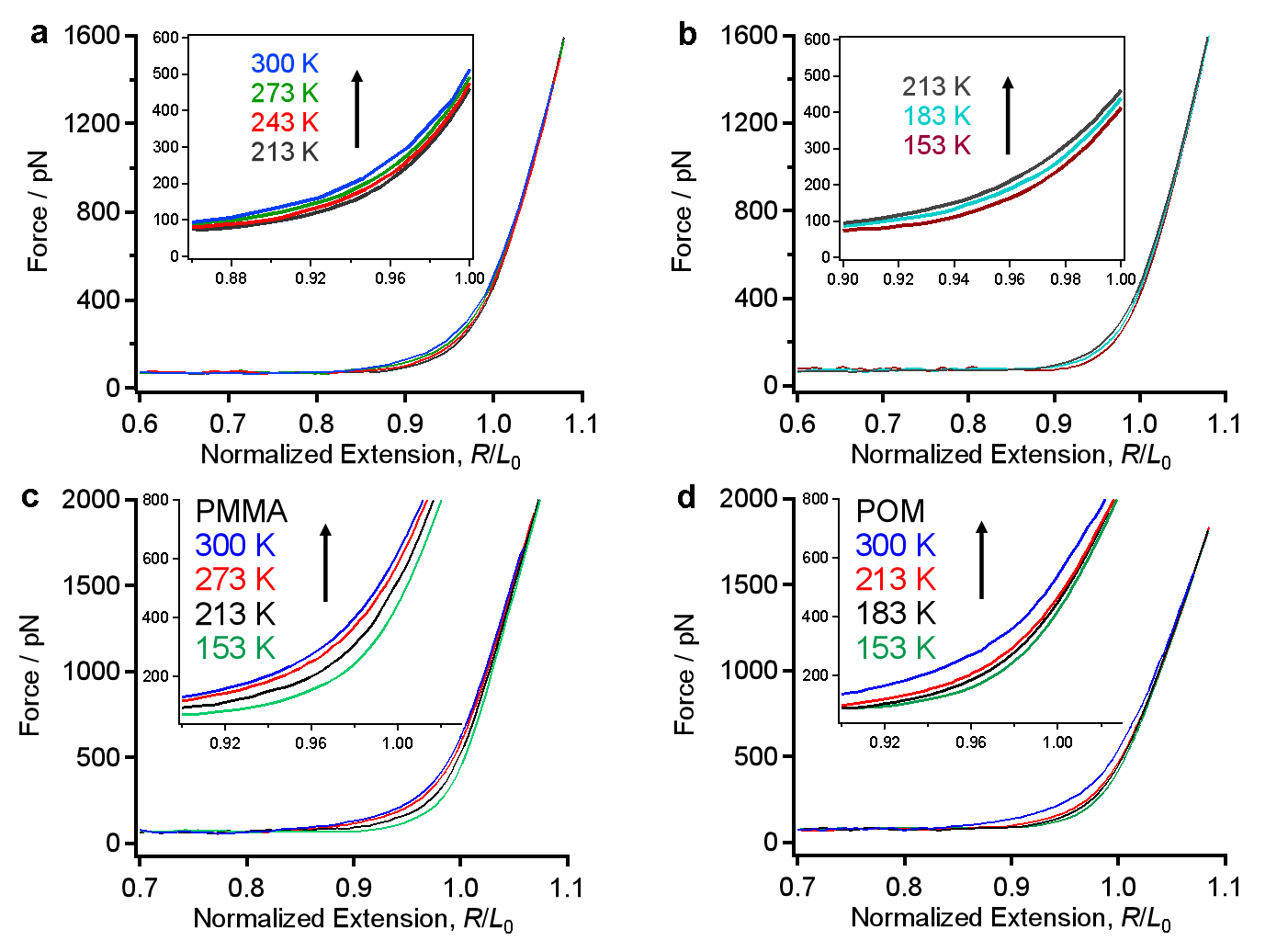 �D2. PDMS��a,b����PMMA��c����POM��d����153-300 K�ضȷ����ȵČ��������