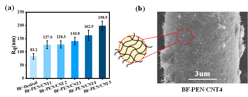 �����s�ϝ{��̎��ǰ�������r�w�S�M�б�����ò���D2���ͱ���ֲڶȣ��D3a���M�б������l(f��)�F(xi��n)��Ó�{�������r�w�S����⻬��AFM�y�õľ������ֲڶ�Rq�H��83.2 nm���@�������ژ�֬���w�Ľ�����𤸽�����S�����s�ϝ{����̼�{�ܺ��������ӣ���(j��ng)Ϳ��̎��������r�w�S����ֲڶ��@�����ӣ���127.0 nm���ӵ�198.5 nm���cBF-Desized��������53%~139%���@���O��������w�S�c��֬�g�ęCе���i���ú͘�֬���w�S�Ľ����������e�أ���̼�{�ܝ���_��0.8 mg/ml�r���ھۺ���PEN�������������ӣ����w�S�����γ��������ľW(w��ng)�j(lu��)�Y(ji��)��(g��u)�����γ�����̼�{�ܾW(w��ng)�j(lu��)�顰��������PEN�ۺ���顰���⡱�ı��o�ʣ��D3b�����@�N��һ�����܉��o�w�S���ܙCе�p������һ�����ڏ�(f��)�ϲ��Ͻ���̎�γəCе�^�ϣ���߽���Y(ji��)�����������c��֬���w��B�γ�ģ���^�Ɍӣ���(y��u)��������Y(ji��)��(g��u)����ߑ�(y��ng)�����fЧ�ʣ����Ə�(f��)�ϲ��ϙCе���ܡ�