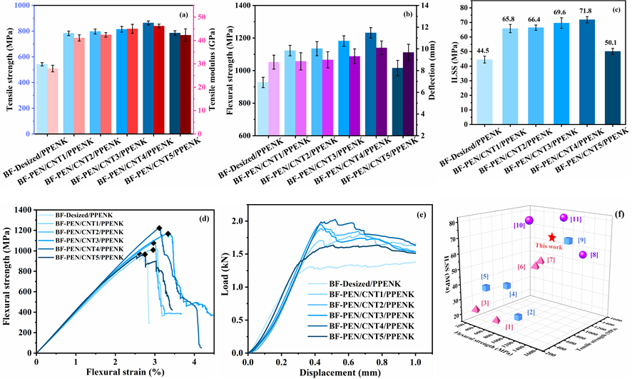 �����s�ϝ{��PEN/CNT̎��ǰ���BF/PPENK��(f��)�ϲ����M�������졢�����͌��g���Мyԇ���D6�����Y(ji��)�������������BF-Desized/PPENK��(f��)�ϲ��ϣ�BF-PEN/CNT4/PPENK�����쏊�ȡ�����ģ�����������ȡ��϶Ⱥ͌��g���Џ��ȷքe�����60%��65%��33%��15%��62%���քe�_����864 MPa��46.2 GPa��1232 MPa��10.1 mm��72 MPa���c�īI���������r�w�S�������w�S��̼�w�S��(f��)�ϲ������̎���^��ˮƽ�����w�����h��(y��u)�ڲ����w�S�����h(hu��n)����(f��)�ϲ��ϣ��C�����ܿ��_������T700̼�w�S����PES��(f��)�ϲ���ˮƽ��