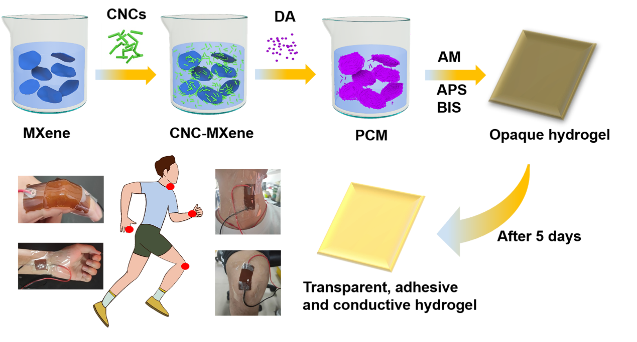 ᘌ����φ��}���A�ώ�����W�܇������ڈFꠏ����о��T�n�}�M�����һ�N�����w�S�ؼ{����CNCs������MXeneˮ��ɢҺ�IJ��ԣ�����PDA�Mһ��������CNC-MXene���棬�γ�PDA������CNC-MXene��PCM����PCM���Ѓ�����ˮ��ɢ�����ԺͿ������ԣ�������Č�늼{�����ϡ���ϩ������AM�����w�l��ԭλ���ɻ��ۺ��γɾ۱�ϩ������PAM���^���У�PCMƬ�����l��APS������С�ߴ��PCM�{����Ƭ���γ��˸����Ե�PCM-PAMˮ���z��PCM-PAMˮ���z�܉���ճ����Ƥ�w�ϣ����Ѓ����Č���ԣ�4.7 S/m�������ԣ�75%��660 nm�����`�������D1��ʾ�������Č���MXene�������ġ�ˮ��ɢ�Č�늼{�����ϺͶ�܌��ˮ���z���о��ṩһ�N�·�����˼·��
