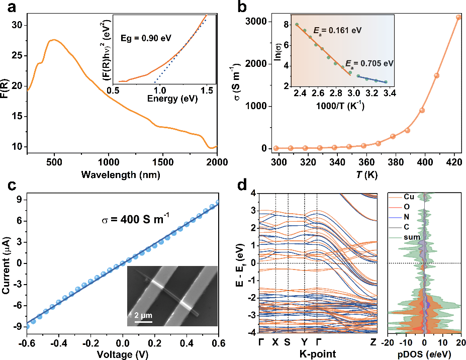 Cu-TAPT�����������V�������W��϶��0.90 eV�������������w�Ĺ�W��϶���c��ƾ��иߌ����CCPs�Ď�϶�ӽ�����298-423 K�Ĝضȅ^�g������ĩ��Ƭ��Ʒ�M��׃�،���ʵĜyԇ���S���ضȵ����ߣ����ϵČ������u������423 K�r�䌧��ʸ��_3100 S m-1�������ڸ��|�����w���w��Ʒ�ī@�ã��҂�������������g�ķ�����EBL�������ˆξ����������y��Cu-TAPT�ξ���Ʒ���Ѓ����Č���ԣ�~400 S m-1��������ՓӋ���֪��Cu-TAPT��������Y���@ʾ����Z-�������M���ܼ��Ͼ��з���B�ܶȣ�������-X, X-S, S-Y�������һ��խ�Ď�϶���@ʹ��Cu-TAPT�������õČ��ͨ����Ҳ��Cu-TAPT���F���^��늌��ʵ�ԭ��