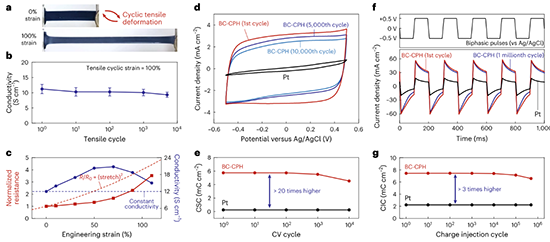 ���˿˷����φ��}��ԓ�F�������p�B�m����늾ۺ���ˮ���z��BC-CPH���OӋ���ԣ���PEDOT:PSS��늌W�ࡢ�Hˮ�Ծ۰�����PU����Cе�������ÃɷN���|��ˮ-�Ҵ��wϵ�е��ܽ��Բ�M������x�{�أ��ڃ����l�����Ƃ���PEDOT:PSS-PU�p�B�m����늾ۺ���ˮ���z������늌W��͙Cе����p�B�m�Y�������@�õ�BC-CPHͬ�rչ�F����늌��ʣ�> 11 S cm-1�����������ԣ�> 400%���Լ��������g�ԣ�> 3,300 J m-2������Ч���F��PEDOT:PSS늌W�����cPU���W���ܵ��ں����D 1����
