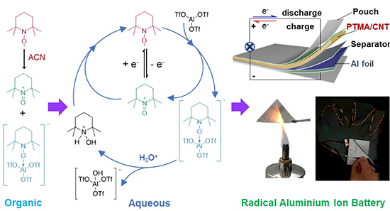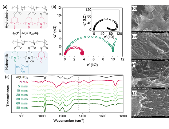 ��QTEMPO늘O������Al(OTf)3·��˹���wϵ�е�늻��W����߀ԭ�����Ե��P�I���}�������Ƃ佛��TEMPO���ܻ��ۺ���PTMA���D2a�����O���ϲ��Lԇ����ˮϵ�X�x��늳ء�늳yԇ�������mȻ��ˮ�Ծ����Y��PTMA��ˮϵ늽�Һ�Пo����Û�����F���O�ߵ�����D���迹��~100 k������������K���x�ӂ�ݔ�c늳س��늣��D2b��������Al(OTf)3�T���绯����������TEMPO+�c [Al(OTf)3TEMPO]- �x�ӣ��x��PTMAһ�����Hˮ�ԣ��@����������D���迹��~10 k���������F��PTMA���O���������늣��D2b & c����SEM�������C�����P늻��W�Y����δ�����늕rPTMA�ۺ����ڌ��̼�{�ܱ���ʬF��ˮ�F�۠���绯��c���늺�PTMA��ˮϵ늽�Һ����Û����������ڌ��̼�{�ܱ��棨�D2 d-g������Ч���M늽��|��ݔ���C�ϣ�PTMA�绯��^�̌����늽��|�}����ˮPTMA늘O�е��x�ӂ�ݔ�����FPTMA�X�x��늳س������P��Ҫ��