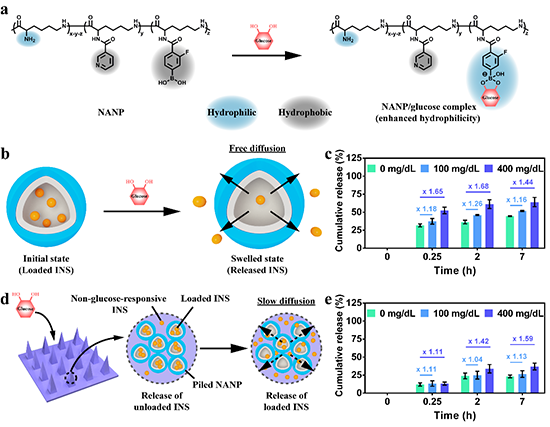Figure 4. (a) The reaction between NANP and glucose. (b) The glucose-responsive INS-releasing mechanism of INS/NANP and (c) the corresponding in-vitro cumulative-releasing profiles. (d) The glucose-responsive INS-releasing mechanism of NA-MNP and (e) the corresponding in-vitro cumulative-releasing profiles. The data of (c) and (e) were shown as the means �� SD (n = 3).