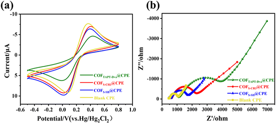 �D(a)�Dz��ϵ�ѭ�h(hu��n)�����D���D(b)��COFTAPT-Dva@CPE��COFS-CH3@CPE��COFS-SH@CPE�Ϳհ�CPE��늻��W(xu��)�迹�V���ο�˹�؈D����ѭ�h(hu��n)�����D�п��Կ������c�հ�̼��늘O���COFTAPT-Dva���̼��늘O������߀ԭ�及(qi��ng)�����@���ͣ����������c߀ԭ���g���λ���Ep�������@����������늘O������ڵ���ˮ��COFTAPT-Dva��������ӂ��f����(d��o)����늘O��(d��o)���׃�Ҳ�c�����迹�D��COFTAPT-Dva@CPE��Rctֵ���@��������(du��)��(y��ng)��COFTAPT-Dva�ď�(qi��ng)��ܗ���Լ������S������ϩ�����܈F(tu��n)ʹ������^��(qi��ng)����ˮ�ԣ���Fe(CN)63-/4-ͨ����(hu��)�cˮ�����γɺ�ˮ��(f��)������������߀ԭ��(d��ng)���W(xu��)��(hu��)�ܵ���ˮ�Ե�늘O����ɔ_[109]��COFS-CH3@CPE��COFS-SH@CPE��ѭ�h(hu��n)���������cCOFTAPT-Dva@CPE��ȣ�����߀ԭ�����ֵ�����ҡ�Ep�pС���Ɯy����������/�������܈F(tu��n)������p����COFs�Ǽܵ���ˮ��ͬ�r(sh��)�ṩ�˸���Ļ���λ�c(di��n)�Ķ���(y��u)����늘O�����늺ɂ��f���ܡ���늻��W(xu��)�迹�V�D�п��Կ������հ�̼��늘O��Rctֵ��С��COFS-CH3@CPE, COFS-SH@CPE��COFTAPT-Dva@CPE��Rctֵ���������f����(j��ng)�^COFs����̼��늘O�����늺��D(zhu��n)�����׃���@��Ҫ������COFs���ϵČ�(d��o)����^��c̼����(f��)�Ϻ�ʹ��늌�(d��o)�ʽ��ͣ���K��늘O��������D(zhu��n)�ƣ��cCV�D�V��һ�¡�