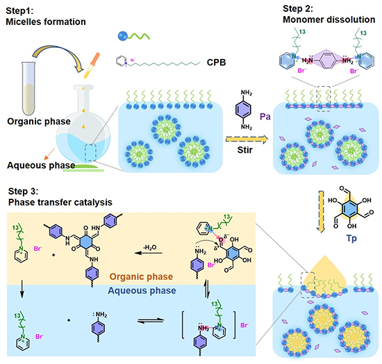 ���Mһ��̽ӑ���D�ƴ��C�����о��ˆ��w���������COF��ò��Ӱ푡��l�Fֻ���ܽ������Ԅ�������Pa���w���ܫ@�ü{�������ΑB��FT-IR���V�@ʾ��������Ԅ�����Pa���������@׃���������p���{�ƣ��քe��3192��3295��3373 cm-1����3201��3329��3412 cm-1��ͬ�r��CPB��C-N���687 cm-1�{����690 cm-1��Figure 1 b������ˣ��Ɯy������Ԅ������cPa����ã�Scheme 1 step 1��������֮�g���o�����Ì���Pa���z���⾉�����ܣ�Scheme 1 step 2�������ȼ���Ĵ���ʹTp�ܽⲢ�ڷ����г�ַ�����ͬ�r������}��x��߀��ͨ�^ż�O�o�����ü���Tp���w�ϵ��һ���CPB�cˮ�������w�Ƶ����࣬�y��Pa�c���Tp�l��������Scheme 1 step 3�����a��ͣ�����z���ȣ����a��ˮ���ڱ�����Ԅ�����ˮ�������z����������������Ԅ��������ˮ�h��ʹ�����D�ƴ���ˮ��Һ�еļ{���z���{����������ɣ��@�����ǿ��ٺϳ��^�̵���Ҫԭ����10 min��Y�������a��ϴ���CPB����ʧ��Figure 1 b�����f�����ڷ����^���ЃH���������ã�ϴ��ص�o�������@Щ����׃�����������ԓ�ϳɷ����������D�ƴ��C����