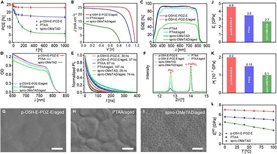 �������㽭��W(xu��)���W(xu��)ϵ���i�����n�}�M�����ܶȷ�����Փ��DFT��Ӌ(j��)���������s[5]��ϩ��O5H����3,4-�ғζ�����ԣ�EDOT����10-��2-����ʮ�������-10H-�������POZ����3,4-�ғζ�����ԣ�EDOT��ȡ��һ���O5H���õ�һ�N��Ԫ���湲������p-O5H-E-POZ-E, �D1������ՓӋ(j��)�������p-O5H-E-POZ-E��HOMO�ܼ��cspiro-OMeTAD�ஔ(d��ng)���䲣�����D(zhu��n)׃�ض���268��C���@�����^spiro-OMeTAD��153��C����PTAA��118��C�����о��l(f��)�F(xi��n)�����ܽ��Ե�p-O5H-E-POZ-E�����c�՚⓽�s�o��ԇ���p������������������䇣�LiTFSI���������ڸ��N�r�����γɾ������ܵı�Ĥ���������õ�늺ɂ�ݔ�ԡ���p-O5H-E-POZ-E��HTL��PSC��(sh��)�F(xi��n)�����PCE��25.7%��ƽ��PCE��24.9%����ͬ�ӗl���������^spiro-OMeTAD��ƽ��PCE��24.0%����PTAA��ƽ��PCE��21.6%���Č���늳ء���Ҫ����������p-O5H-E-POZ-E��PSC��85 ��C���ϻ�1000 h��PCE�����ʞ�93%; ��40 oC������c(di��n)��MPP��ۙ500 h, PCE�����ʞ�98%���@����(y��u)�ڌ���늳���������ȫ�������������������: p-O5H-E-POZ-E������ߏ���ģ���������я�(qi��ng)�����߃�(n��i)�����ܶ�������ˮ�Ժ͵��x�ӔU(ku��)ɢ�Ե��P(gu��n)�I�������Ķ��x��PSC��(y��u)�����᷀(w��n)�����Ͳ�����(w��n)������ԓ�о���ͬ�r(sh��)������Һ�ɼӹ�������(y��u)����늺ɂ�ݔ���ܺ����W(xu��)���ܵİ댧(d��o)�w�ۺ�����O(sh��)Ӌ(j��)�ṩ�˪�(d��)�ص�ҕ����