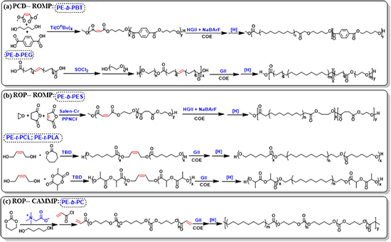 ���Զ�Ƕ�ξۺ�����Ƃ䣺1. �s��-�_�h��λ�ۺ�(PCD-ROMP)�ò����Ƃ�������ϩ-�ی���������������������Ƕ�ξۺ���(PE-b-PBT)��������ϩ-���Ҷ�������Ƕ�ξۺ���(PE-b-PEG)������ͨ�^�s�۷����Ƃ���机��Ѓ�ϩ�N���O����;��������^�����˾ۺ�����HGII������NaBArF�������������c�h��ϩ(COE)�l���_�h��λ�ۺϷ��������þۺ����Mһ���仯�����Ƃ�PE-b-PET��PE-b-PEG��Ƕ�ξۺ��������D2a��ʾ���� 2. �_�h�ۺ�-�_�h��λ�ۺ�(ROP-ROMP)�ò����Ƃ�������ϩ-�۶������Ҷ���������Ƕ�ξۺ���(PE-b-PES)��������ϩ-�ۼ�������������������Ƕ�ξۺ���(PE-t-PCL(PLA))������ͨ�^�h�����顢�������������Ѓ�ϩ���܈F���R�������_�h���ۻ�ʹ�ô�����|���������w�M���_�h�ۺ��Ƃ���机��в���p�I�ľ������������˾ۺ�����GII�����Ĵ������cCOE�l���_�h��λ�ۺϷ��������þۺ����Mһ���仯�����Ƃ�PE-b-PES��Ƕ�λ�PE-t-PCL(PLA)��Ƕ�ξۺ��������D2b��ʾ���� 3. �_�h�ۺ�-�h��ǭh���w��λ�ۺ�(ROP-CAMMP)�ò����Ƃ�������ϩ-��̼��������Ƕ�ξۺ���(PE-b-PC):����ͨ�^�_�h�ۺ��Ƃ��̼�����������ٌ����c��ϩ���ȷ����Ƃ��pϩ�N��˵ľ�̼�������^�����˾ۺ�����GII�����������cCOE�l���h��-�ǭh���w��λ�ۺϷ��������þۺ����Mһ���仯�����Ƃ�PE-b-PC��Ƕ�ξۺ��������D2c��ʾ����