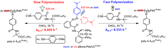 �ܵ��ڰ��h����alkyne-Pd(II)/LR-azo���lD-1��L-1�ۺϷ������ʾ��Ć��l����alkyne-Pd(II)/LR-azo���l�������wD-1/L-1�Č�ӳ�x���Ծۺ��M��̽�����ڰ��h����D-1���Ⱦۺ��������Y��������w��L-1�^�����䌦ӳ�w�^���ٷֱ�(eeֵ)��67%��420 nm��Դ�������M����ͬ�ӵČ�����˕rL-1������D-1���ۺ���������w��D-1�^������eeֵ��66%��CD�Y���������õľۺ���poly-D-1100(LR-azo)��������ղ��L̎�Ħ�?364��19.3 M?1·cm?1��ʹ��alkyne-Pd(II)/LS-azo���lD-1/L-1�ۺϕr�õ��ľۺ���poly-D-1100(LS-azo)��������ղ��L̎�Ħ�?364��-19.2 M?1·cm?1���C��alkyne-Pd(II)/LR-azo�����l���������w��ӳ�x���Ծۺϵõ���һ�����ۺ�����
