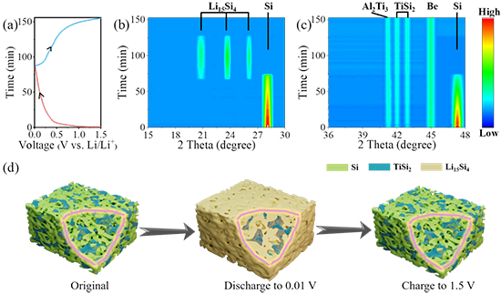 ����ԭλX�侀����x�O�y��늳��кϽ�ؓ�O�ľ���׃������Be���ڵ�������⣬��40��~44���������^�쵽�cAl2Ti3��TiSi2������������壬�@�c��ʼ��Ʒ��X�侀�����V��һ�¡���������/����^���У��@�ɷN�Ͻ������屣������������������������ǻ��ԺϽ𣬲����c�Q�/Ó䇷����������ڷ�����ĽY�����ں�������^���У���ľ��w�������F����������u���͡��S��������LixSi�D׃��Si���������K��ʧ���@�c��ȦCV�����������-늄������еķ����������S��Li15Si4����������F���ஔ���Ҝ���3579 mAh g-1����Փ��������ԭλX�侀�������������Si-Ti�Ͻ�����һ�N�ǻ��ԺϽ𣬲��]�и�׃Si/Si-TiꖘO���/Ó䇙C�������F���c��Si���Ƶ��О顣��ˣ�Si/Si-TiꖘO���/Ó䇙C���飺����늵�0.01V�r�����^�Ͻ�����ؓ�O���F�w�e��Û��Si15Li4�w������s�����϶�����ںϽ�Ǽܵ�֧�����ã�Si/Si-TiꖘO�ڷ��-����^���б�������Y���������ԣ�ͬ�r�p���˲����淴���������ѭ�h�����ԡ�