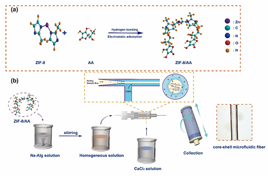 Figure 1. Scheme illustration of (a) the preparation of ZIF-8/AA and (b) the core-shell alginate functional membrane using coaxial microfluidic spinning.
