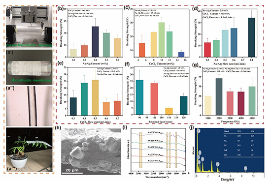 Figure 2. (a) coaxial microfluidic spinning (a��) SA/ZIF-8/AA microfluidic membrane (a����) SA/ZIF-8/AA microscopic view (�� 60 times); (a������) lightweight of the modified membrane; (b)~(g) the influence of microfluidic wet spinning parameters on mechanical properties; (h) the cross section of SA/ZIF-8/AA membrane; (i) FTIR spectrum of SA/ZIF-8/AA with different content of ZIF-8/AA; (j) EDS of SA/ZIF-8/AA membrane.
