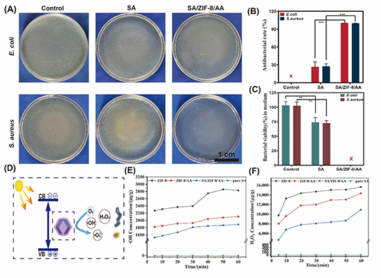 Figure 3. The qualitative and quantitative assessments of the SA/ZIF-8/AA oriented membrane (A) the photos of bacteria colonies antimicrobial performance of the membranes; (B), (C) the quantitative analysis of the bactericidal performance of the membrane against two bacteria; (D) mechanism of the antibacterial properties of ZIF-8 nanomaterials; (E), (F) the release of reactive oxygen species from the membrane