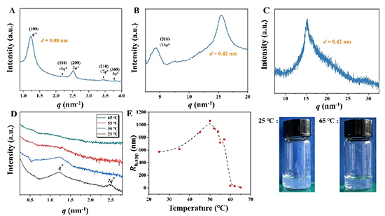 ���⣬С��X�侀ɢ�䣨SAXS������C����ԓƬ��Y���ʬF�߶Ȍ��Q������������Y�������V��X�侀���䌍�y��������֮�g�ĂȲ����x��0.42 nm���cSAED��HRTEM�Y��һ�£�����ԓ��߅��Ƭ���z���ʬF�����в�ͬ�Ӵε�����Y�����D3�������⣬���z����Һ�ӟᵽ55 - 65 ��C�r��ԭλ�ض���هSAXS�@ʾɢ���׃�Ï�ɢ����ȫ��ʧ���@���������朵Ķѷe�Y���ڸߜ�����ȫ�o���S�ض�׃���ĄӑB��ɢ�䣨DLS�������@ʾ������Һ�ضȼӟᵽ55 �����ϕr�����^���w���W�돽��Rh,app�������½����@������朵���׃������Ƭ���z���Ľ��w��Ҳ�C���˶�ʮ��̼�����朵ă����Y����������Ƕ�ι������ԽM�b�ɶ��SƬ���z������Ҫ������