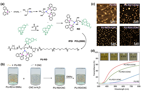 �D1. PU-RD��PU-RD/CNC���Ƃ�����ܱ���. (a) PU-RD�ĺϳ��^��. (b) PU-RD/CNC���Ƃ�ʾ��D. (c) PU-RD��PU-RD/CNC��AFM�߶ȈD. (d) PU-RD��PU-RD/CNC����������V�D. (��: PU-RD, ��: PU-RD/1.0CNC, ��: PU-RD/3.0CNC, ��: PU-RD/5.0CNC).
