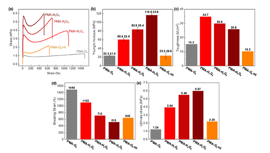 ֮�����ߌ��ۺ���ӗl�ęCе���|�M���˱������D6�������^�ڌ��սMPMA-G4���H��0.1 mol%��H�M�ֵ��ۺ���PMA-H1G4���C���Cе������Ӳ�ȡ��g�ԡ����ȡ�ճ�����ȣ����F���@��������������ģ��60.4 MPa��������2.6���������ё���3.9 MPa��������3.2�������g��34.7 MJ/m3 ��������2.3���������⣬�ڌ��ۺ���Ϳ���c��Ƭ��������֮�g�䮔ճ�τ��r��PMA-H1G4���F���˃�����ճ������3.7 MPa��