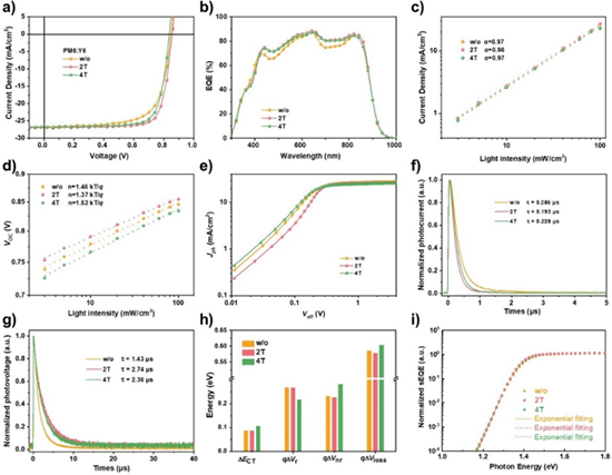 ���ڴˣ��|�A��W��x�����ڡ����A���о��T�Լ����ڼ��g��W�������������չ�_���������ɂ��Ѿ���Է��ӣ���2T��4T�����뵽����PM6:Y6�Ķ�ԪOSCs�У����˽��@Щ���ӄ����Ӱ푳�Ĥ�����W�^�����{����ò���Լ�������OSCs�Ĺ�����ܡ��о��l(f��)�F(xi��n)4T��Ҫ���������w����Y6�ľۼ�����2T����Һ�ӹ��^�������ԅf(xi��)ͬ����PM6��Y6���N���ϵ��ۼ����x�蹲��Ĥ������ķ��Ӷѷe���Ķ��@�������ƽ���늺ɂ�ݔ�����⣬2T�{(di��o)�صĹ���Ĥ���F(xi��n)���������Ĵ�ֱ����x���@�������늺���ȡЧ�ʣ�ͬ�r����늺ɏͺϡ��Y���������������ӄ���OSCs���F(xi��n)��16.1%��PCE����·����ܶȣ�JSC����26.7 mA cm?2��VOC��0.846 V��������ӣ�FF����71.2%������2T���ӄ�̎���������ڸ�������(sh��)�϶����^���@�ĸ��ƣ����F(xi��n)��26.9 mA cm?2��JSC��0.854 V��VOC��78.6%��FF����K����18.1%�����PCE���@�ǻ���PM6:Y6 OSCs�����ֵ֮һ�����֮�£�4T���ӄ�̎����OSCs�ț]�����ӄ�̎��������������������PCE��17.2%��FF��76.8%��ͬ�r�^�쵽VOC�Խ���2T̎����������PCE��VOC�Լ�FF����ă�(y��u)Խ�Ա����Ѿ�����ڻ��Ԍ���ò���ƣ����Əͺϓpʧ���F(xi��n)�����������Ͼ�����Ҫ���á�