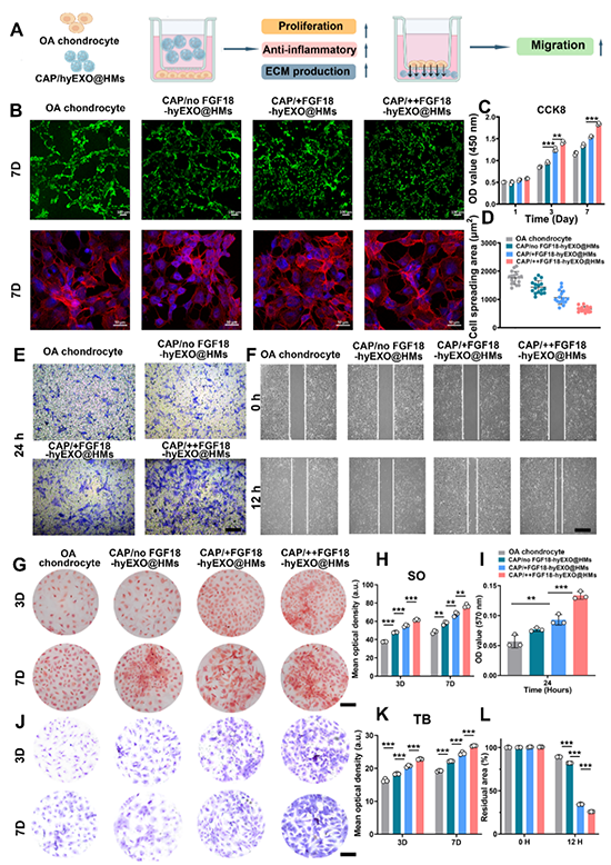 �Mһ���أ�����IL-1���T����OAܛ�Ǽ���ģ���о���CAP/hyEXO@HMs��OAܛ�Ǽ������ί����á��w�⼚����������CAP/hyEXO@HMs�������õļ��������ԣ��܉���MOAܛ�Ǽ�����ֳ���w�ơ�ܛ�����P���|���ں�ECM�ϳɣ��D6���������÷�������W�ֶΣ��Mһ����ʾ��CAP/++FGF18-hyEXO@HMs��OAܛ�Ǽ������ί������ÙC�ƣ��l�Fͨ�^FGF18���{������PI3K/AKT��̖ͨ·���Ķ����MECM������ͬ�r�����װY�ͻ��|���⣨�D6����