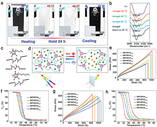 �D2 (a) ISP/30%IL0.8�x�����z��(1)20 ��C�ӟᵽ(2,3)40 ��C������24С�r��(4)�S����s��20 ��C����Ƭ����D:��W�@�R�D��(b)��Ԫ�x��Һ�w([Hmim][TFSI]:[Bmim][TFSI] = 0.8)��ISP/30%IL0.8�x�����z��׃��FTIR���V��(c) Hmim(��)/Bdmim(��)�cPPG朶�֮�g���I�γɵ�ʾ��D��(d) ISP/mILn�x�����zLCST�О�ęC��ʾ��D��(e, f)�x��Һ�w������ISP/mILn�x�����z���W���ܺ͟���׃ɫ���ܵ�Ӱ푡�(g, h)��Ԫ�x��Һ�w�|���Ȍ�ISP/mILn�x�����z���W���ܺ͟���׃ɫ���ܵ�Ӱ푡�