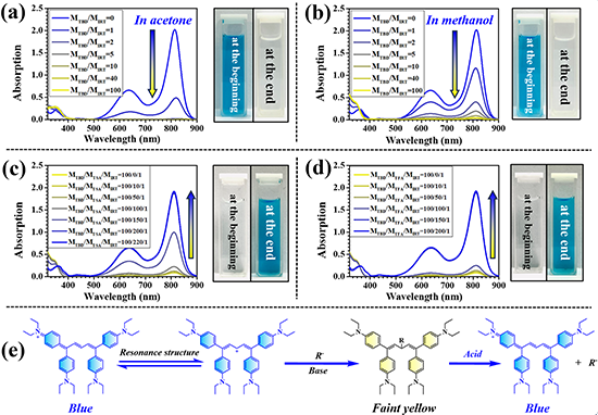 �D3 ��ͬĦ���ȵ�TBD�cIRT�ģ�a����ͪ�ͣ�b���״���Һ��UV-vis-NIR�����V�D��IRT�ĝ�ȱ�����1 × 10?5 mol L?1������ͬĦ���ȵģ�c��TBD/TSA/IRT�ͣ�d��TBD/TFA/IRT�ģ�a����ͪ�ͣ�b���״���Һ��UV-vis-NIR�����V�D��IRT�ĝ�ȱ�����1 × 10?5 mol L?1������e��IRT��A׃ɫ�ęC��