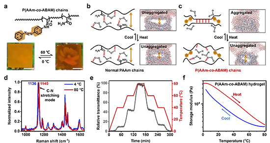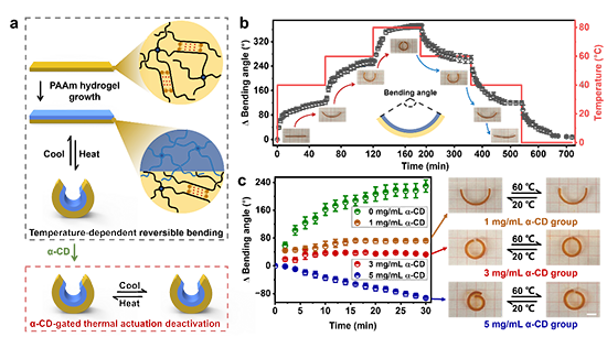 ��������P(AAm-co-ABAM)ˮ���z��׃������������ǰ�ڵĹ�����CCS Chem. 2022, 5, 704�����о��ˆTʹ�ý���Uɢ�ۺϣ�Interfacial Diffusion Polymerization, IDP�����ԣ���P(AAm-co-ABAM)ˮ���z�������LPAAm���ӌ����z���������p��ˮ���z�������D4a��������P(AAm-co-ABAM)ˮ���z�Ĝ������ԣ�ԓ�p��ˮ���zҲ�ܱ��F(xi��n)���ڜض���ه��׃���О飨��׃�γ̶ȿ�ͨ�^�h(hu��n)���ضȄӑB(t��i)�{��(ji��)���D4b���Լ����W�T�ص�׃���О飨��3 mg/mL ��-CD��Һ�в��ٱ��F(xi��n)����׃���О飬�D4c����