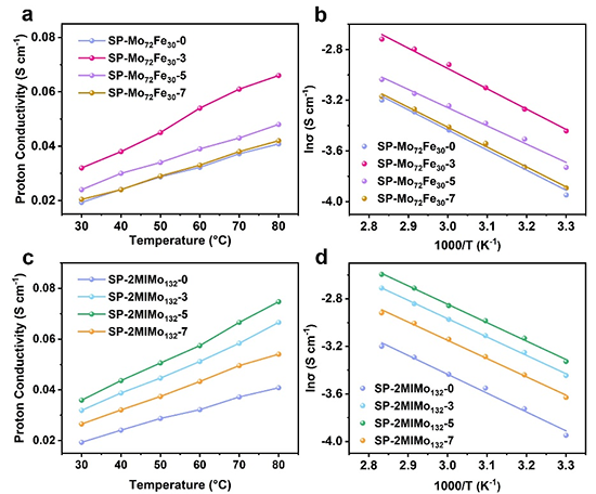 �D6. a SP-Mo72Fe30-x�ڲ�ͬ�ض��µ��|(zh��)��늌�(d��o)�ʺ�b Arrhenius������c SP-2MIMo132-y�ڲ�ͬ�ض��µ��|(zh��)��늌�(d��o)�ʺ�d Arrhenius����