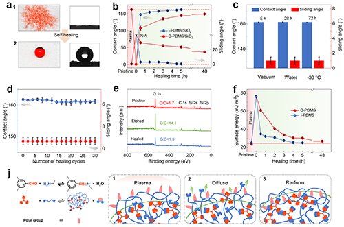 �D3 (a)���x�ӿ��gI-PDMS/SiO2Ϳ�����ޏ�ǰ(1)�����ޏͺ�(2)ˮ�εĸ�ҕ�D(��)���@�R��ҕ�D(��)��(b) I-PDMS/SiO2��C-PDMS/SiO2Ϳ�ӵ��x���w���g����25 ���²�ͬ�r�g�ޏ�����|�Ǻͻ��ӽǵ�׃����(c) ���x�����g��I-PDMS/SiO2Ϳ����-30 ���՚��25 ��ˮ��������ޏ���Ľ��|�Ǻͻ��ӽǡ�(d)��ͬ�Δ����x���w���g�����ޏͺ�I-PDMS/SiO2Ϳ�ӽ��|�Ǻͻ��ӽǵ�׃����(e)ԭʼ�����x�ӿ��g���ޏ͵�I-PDMS/ SiO2Ϳ�ӵ�XPS���V��(f) I-PDMS��C-PDMS��Ĥ�ڵ��x���w���g�Ͳ�ͬ�r�g�ޏ���ı�����׃����(j)I-PDMS/SiO2Ϳ�����ޏ��C��ʾ��D��(1) �O�Ի��F�����x���w���g��I-PDMS/SiO2Ϳ���ϡ�(2) NH2-PDMS-NH2��BTC���ܓp�����Uɢ��(3)�O�Ի��F�����γɵ�I-PDMS������