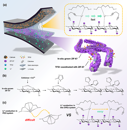 ���˽�Q�@һ���}�����u��W�����������ڈF�������һ�N�����Բ��ԣ���ͨ�^�ںτ��Թ������Ǽ��cܛ�ۺ�������|���Ƃ������ģ�CPEs�������w���ԣ������S�w�S���w�S�Ǽܣ�CF����ԭλ���L��ʯ��������ZIFs�������c���܄������棨SN��һͬ�����������ϩ��PEO���ۺ���늽��|�У��Ķ��ɹ����Ƴ���ZIF-67@CF/PEO-SN CPEs��ͨ�^��PEO������ZIF-67@CF��SN�����F��CPEs�����c늻��W���ܵąfͬ���������⣬ԓ�����\�����ܶȷ�����Փ������̽ӑ��Li+��CPEs�еĂ����C�ơ�ֵ��һ����ǣ���30 ��l���£�ZIF-67@CF/PEO-SN CPEsչ�F���˳�ɫ�����ܣ��x��늌��ʸ��_1.17×10�C4 S cm�C1��Li+�w�Ɣ��_��0.40��늻��W���ڌ���5.0 V�����������@��������_��18.7 MPa�����僌�/���x�����ԃ���������0.1 mA cm2�ėl���·����\�г��^550С�r���@Щ����ʹ��LiFePO4/(ZIF-67@CF/PEO-SN)/Li늳���30��rչ�F���߷��������0.2C��152.5mAh g�C1�����Lѭ�h���������^150��ѭ�h�����������ʸ��_99 %���Լ���ɫ��ʹ�ð�ȫ�ԡ�ԓ�������H�鹦�ܻ�CPEs��ȫ�̑B䇽���늳�ASSLMBs�еđ����ṩ�����Ҋ�⣬ͬ�rҲ�Ƅ����Ҝ�ȫ�̑B늽��|��ASSEs���İlչ��ԓ�о����}�顰A three-dimensional metal-organic-framework@cellulose skeleton reinforced composite polymer electrolyte for all-solid-state lithium metal battery����Փ�İl��������һ�ڡ�ACS Nano���ϡ����u��W�C늹��̌WԺ�о������Ξ鱾�ĵ�һ���ߣ����u��W�C늹��̌WԺ���������ɼ�����ϵ�y���̼��g��������Դ늳ز��ό���ҏ����������ں������������ڞ鱾�Ĺ�ͬͨӍ���ߣ��������õ����Ї���ʿ��ƌW���𡢺���̩ɽ�W���Ŀ����I�����Ŀ���Y��֧�֡�