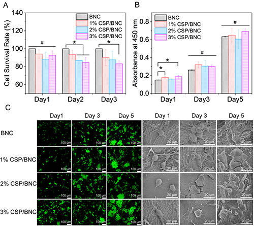 �D8. BNC��CSP/BNCĤ�ļ�(x��)�������ԣ�A����(x��)������ʣ�B����(x��)����ֳ��r��C����(x��)���ɹ�Ⱦɫ��FE-SEM�D��#p��0.05��*p��0.05��