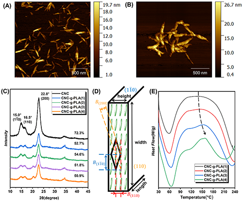 �D3. CNC(A)��CNC-g-PLA(4) (B)��AFM�D��CNC���ķNCNC-g-PLA��XRD�V�D(C)�ͽY��ģ��(D)���ķNCNC-g-PLA��Ʒ��DSC�D(E)