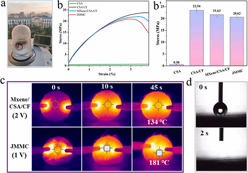 �D5. (a)�����l�^���У�JMMC���l�����\��ʾ��D��(b)CSA��CSA/CF��MXene/ CSA/CF��JMMC���l����2 mm/min�l���µđ���-��׃������(c)��ʽMXene/ CSA/CF��JMMC���l ���Ľ����ӟግ(d)��ˮ����ԇ