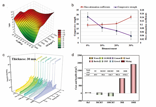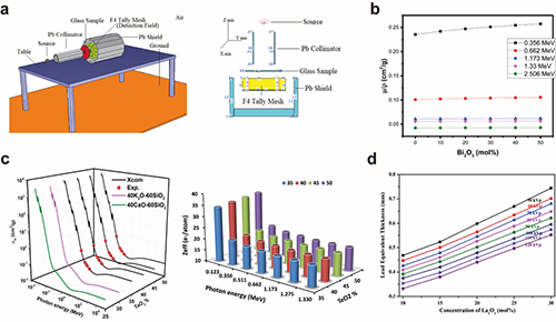 �D4 a) MCNPX���ɵ�ģ�M�O�����wҕ�D��b)��ͬBi2O3����������U�G�����|��˥�pϵ����c) xTeO2-(70-x)ZnF2-25As2O3-5Sm2O3�����wϵ�����������}�����wϵݗ�����ܣ�d) (80-x)B2O3-10SiO2-10CaO-xLa2O3�����wϵݗ�����ܡ�