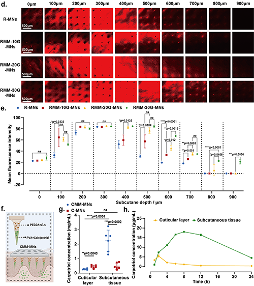 ���˴_�������l�әCᘣ�MM-MNs������Ч��������횶����u������w���a���������m�r�g���о�������ͨ�^�{����м��d�������ǝ����������Ч���ƚ��w��������������Ƃ��˲�ͬ��ȵ�ᘣ��Y���@ʾ30 mg/mL�����ǵ�ᘾ߂����L�Ě��w���a���m�r�g�������w�a�������⣬MM-MNs�Ě��w������ͨ�^�����iƤ�M�Мyԇ���Y���@ʾ�ڲ�ͬ��ȵ�Ƥ�w�������w�B�����������ã��e����5 mm��ȕr������Ч�B���@������Ƅ�ˎ���M��M�������ṩ����Ҫ���A���C�ϔ���������E.A.���a���Ě��w�܉�B����Ƥ�������B��ȳ��^5 mm��չʾ�����������R�_��ˎ���f���еľ�����