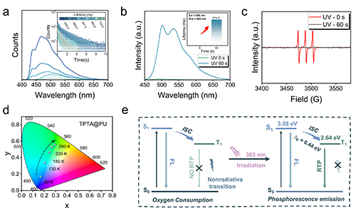 ���ߺY�x��ϵ�а������h(hu��n)�����Ƃ������Խ�(li��n)�ۺ��ﱡĤ����ԓ�wϵ�У��������ʻ��͵�ԭ�Ӵ��M(j��n)�������B(t��i)���ӵ����ɣ��W(w��ng)�j(lu��)�Y(ji��)��(g��u)�����w���\(y��n)��(d��ng)�����ƣ��_���������B(t��i)���ӵķ�(w��n)���ԣ��D1a�����ۺ��ﱡĤ���F(xi��n)����(y��u)���ĺ������ԣ������⼤�l(f��)���@ʾ����(y��u)���İl(f��)�����ԣ������L��������ߵ����Ӯa(ch��n)�ʣ��D1b,c�����ڴ˻��A(ch��)�ϣ����ߌ���Ĥ�Ĺ��������|(zh��)����l(f��)��C(j��)���M(j��n)�����M(j��n)һ����������Ĥ���F(xi��n)���ߵ����ԣ��������ݗ�պ��F(xi��n)����Ч�����x�l(f��)�䣬��������L���_(d��)972.3ms��������߿��_(d��)1.2cdm-2���D2����TPTA@PU��Ĥ�Ĺ��V��(qi��ng)���Լ������S�ضȵ����߱��F(xi��n)�����@��ؓ(f��)���P(gu��n)�ԣ��C��(sh��)��ԓ��Ĥ�İl(f��)��Դ��RTP���ǟἤ�����t�ɹ�(TADF)������ݗ��60s��TPTA@PU��Ĥ�Ĺ��V�͏�(qi��ng)�ȴ�����������@�w�Y(ji��)������ݗ���^���б�Ĥ��(n��i)������������£��D3����