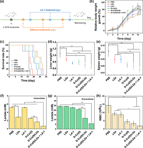 ���ՈD5a��ʾ�ĕr�g��z�y��������f��ϵ�y��LA-1��L1210��Ѫ��ģ���е��w���ί�Ч����L1210��Ѫ�����Գ̶ȸߣ����ڶ̕r�g��ʹС��a��������ˮ����ˮ�ڸ�ǻ�ȷe�ی��°�Ѫ��С���w�����ӣ��D5b����С�����ʣ��D5c���@ʾ���Y�Mչ�õ����⡣��Ѫ���Ը�Ƣ����Ҫ�����K�����Ը�Ƣ�[�����Ҫ�Y��Y���@ʾ�����K���D5d����Ƣ�K���D5e��ؓ������һ���p�p��ͨ�^�z�yС��ˮ�е�����ˮƽ���l�FD-Cu(II)/LOx + LA-1̎�팧�¼����ȣ��D5f���ͼ����⣨�D5g�����Ậ�������@�����͡��cPBS�M��ȣ�D-Cu(II)/LOx + LA-1�M������WBC��ˮƽ�@�����ͣ��D5h��������D-Cu(II)/LOx + LA-1���ί�������Ч�����Ѫ���Y�