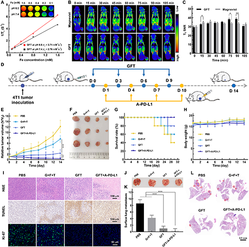 �D5. GFT NCs����4T1�[����MR������ί�����A��GFT NCs�ڲ�ͬpH�l���µ�T1 MR�����Լ�r1��ԥ�ʣ�β�o�}ע��GFT NCs��Magnevist��[Fe] = 0.4 mg×mL-1��[Gd] = 0.4 mg×mL-1��100 mL PBS/ÿֻС��ǰ��ͬ�r�g�c�[���Ļ��wT1�ә�MR�D��B��������������ȣ�SNR����C������D��GFT+A-PD-L1���w�����ί�ʾ��D����ͬ�ί�14���С��������[���w�e׃��������E�����[����������Ƭ��F������ͬ�ί�30���С���������׃��������G���Ͳ�ͬ�ί�14���С��������w��׃��������H������I����ͬ�ί�14���С���[���M����Ƭ��H&E��TUNEL��Ki-67Ⱦɫ��r����ͬ�ί�14���С��εĴ�������Ƭ��J�������D���[���Y������������K���ͷνM����Ƭ��H&EȾɫ��r��L����