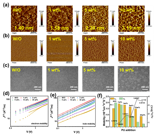 �D4 ��Ĥ�К����������½�������ȱ�ݑB�ܶȵĽ��͡���a����ͬPU�����Ļ��Ԍ�Ĥ��GIWAXS���S�D����b����ͬPU�����Ļ��Ԍ�Ĥ����ͬ�����Δ��µ�XRD�������ƈD����c����������B�ܶȣ�tDOS������d���Cе���ܺ��������ͬ�������C��ʾ��D��