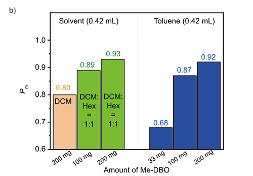 ���߽���ʹ�üױ������܄��M�оۺϡ��������Ȝy�ˆ��wMe-DBO�ڼױ��е��ܽ�ȣ��l�Frac-Me-DBO���ܽ�Ȟ�85.4 mg/mL����W��Me-DBO���ܽ�ȼs��33.4 mg/mL�����Ǟ��˱��־���ۺϣ����ߌ����w�����͞�33 mg/0.42 mL���õ��ľۺ���Pm�H��0.68��������߾ۺϵ�ȫͬ�x���ԣ����߽��Lԇ�Ǿ���ۺϷ����������w����ߵ���100 mg/0.42 mL���l�F�ۺ����Pm�ɹ���ߵ���0.87�������^�m���ӆ��w����200 mg/0.42 mL�����������l���������ֲ�׃���ۺ����Pm�Mһ����ߵ���0.92���D3���������Mһ���U���@�N�ۺϲ��Եđ��÷�����������Me-DBO�����܄�DCM�м��벻���܄������飬�Lԇ�Ǿ���ۺϷ������چ��w����100 mg/0.42 mL��200 mg/0.42 mL�ėl���£��ۺ����Pm�քe�ɹ���ߵ���0.89��0.93���D3����