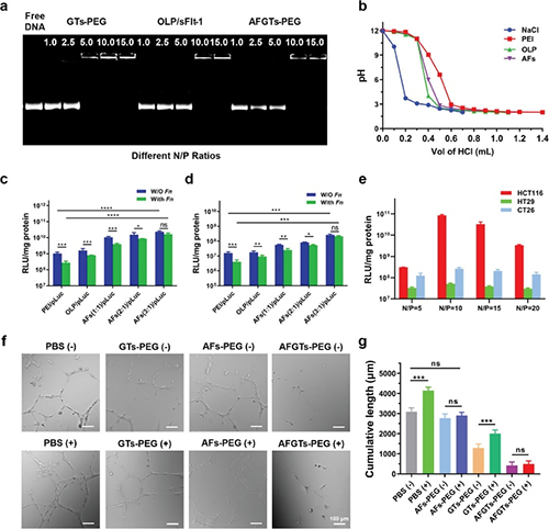 ����AFGTs-PEG�������w�⿹�����ܣ������Mһ���u�r���w������Ѫ������Ч�������z�Ӿ���D3a������AFGTs-PEG�ڵ��ױȞ�10�r������Ч�ͺ�sFlt-1���Ķ�����sFlt-1���\ݔ�^���е�й¶���^��ጷņ��}���|�Ӿ��_�������D3b������AFs�����c�����f�͡��S��˜ʡ�PEI25K���ƵăȺ��w���������������DȾ���D3c-e������LA��OLP���|���ȣ���3��1�r�ҵ��ױȞ�10�r���DȾЧ����ߣ�����x�ô˱����M�к��m���w������Ѫ���γɌ��D3f��g��������ʹ��Fn��Ⱦ�l���£�AFGTs-PEGҲ���@���ؽ���Ѫ�ܵ��γɡ�