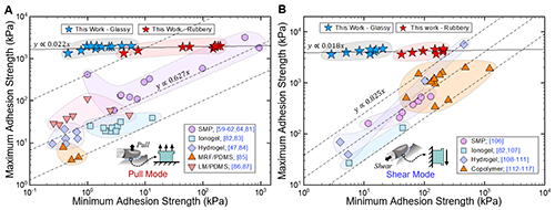 (A) Schematic comparison between the proposed SMP adhesive skin and conventional adhesive designs. In conventional adhesives designs (left), the maximum adhesion strength is proportional to the minimum strength, characterized by large constants of proportionality in both pull and shear modes (middle). This limitation means that strong adhesives and easy detachment cannot be achieved with the same adhesive. In contrast, the proposed SMP adhesive skin features maximum and minimum adhesion strengths that are independent of each other, with very small constants of proportionality (middle). This enables a wide tunability in adhesion, allowing the adhesive skin to function effectively in scenarios where adhesion is either required or to be avoided, thereby greatly enhancing robotic interactions (right). (B) SMP adhesive skins integrated onto a robotic hand (left) to enhance its capabilities to interact with the environment. The robotic adhesive skin patches (right) are featured by arrays of hexagonal SMP adhesive fibrils on the surface and then embedded flexible heaters and pressure sensors connected by SMP adhesive interlayers. (C) Principle of on-demand attachment and detachment of a single SMP adhesive fibril on the adhesive skin. �� Minimal adhesion when contacting in the glassy phase. �� On-demand attachment when contact is established in the rubbery phase. �� Strong DMT-like R2G adhesion after cooling into the glassy phase. �� Switch-off of adhesion by heating up back into the rubbery phase where the SMP fibrils are detached in a JKR-like state.