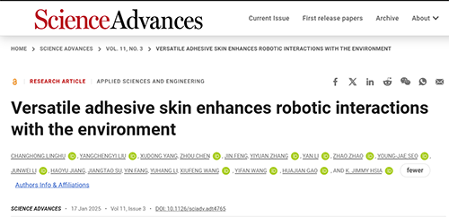 [1]Changhong Linghu, Yangchengyi Liu, Xudong Yang, Zhou Chen, Jin Feng, Yiyuan Zhang, Yan Li, Zhao Zhao, Young-Jae Seo, Junwei Li, Haoyu Jiang, Jiangtao Su, Yin Fang, Yuhang Li, Xiufeng Wang, Yifan Wang, Huajian Gao, and K. Jimmy Hsia. Versatile adhesive skin enhances robotic interactions with the environment.Science Advances, 2025, 11(3): eadt4765.